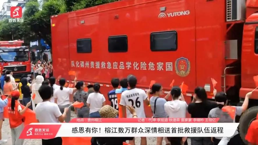 7月3日,榕江县数万群众深情送别首批救援队伍,贵州磷化队也在其中。街头有人挥手、抹泪,有人举起了感谢的横幅。这时,人群中传来呼喊声,曾为队员提供便利的一位大姐奋力挤出人潮,追着车门边跑边哭:“谢谢你们啊!一定要再来榕江玩……”