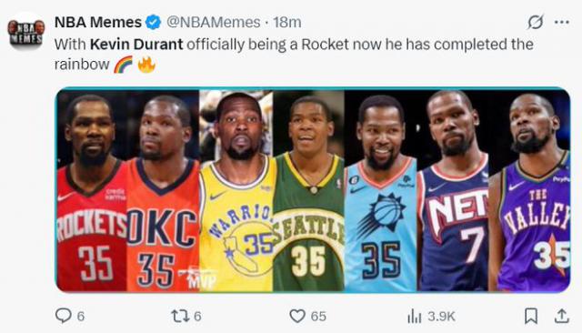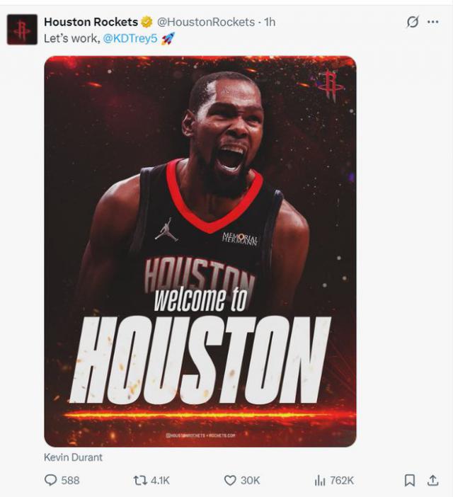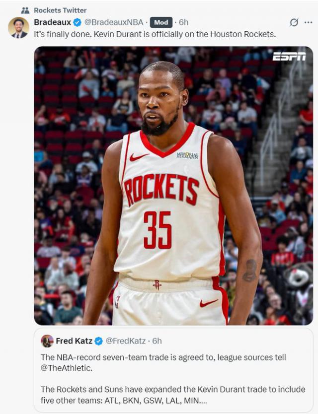 火箭队官方宣布凯文 - 杜兰特正式加盟,这笔7方大交易尘埃落定。北京时间7月7日,对火箭球迷而言意义重大,摆烂五年的火箭队终于迎来一位真正的超级巨星,尽管这位超巨即将年满37岁。