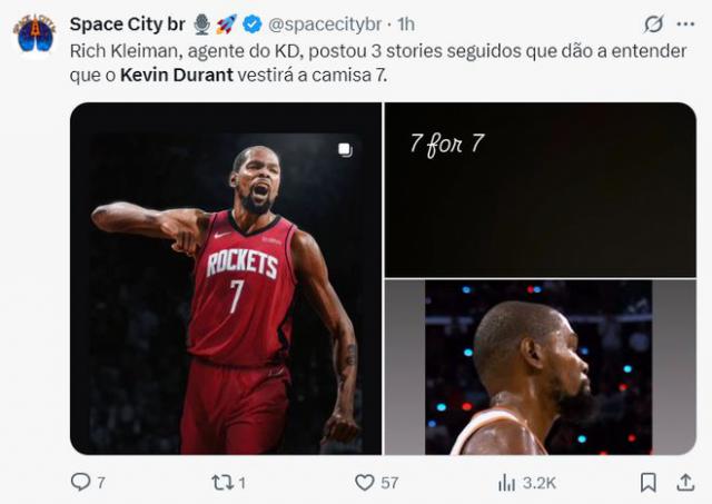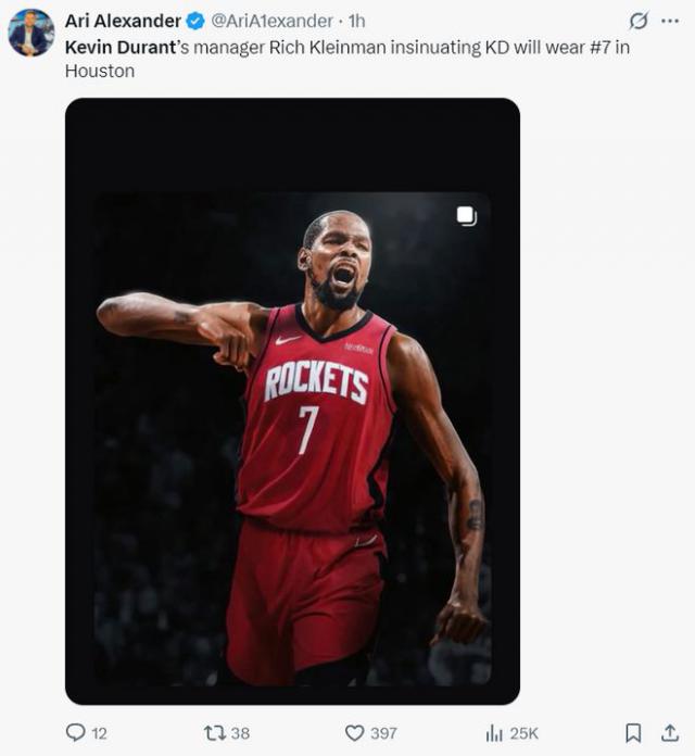 美媒报道,杜兰特的经纪人里克 - 克莱曼连续发了三条IG,暗示杜兰特将重新穿上七号球衣。