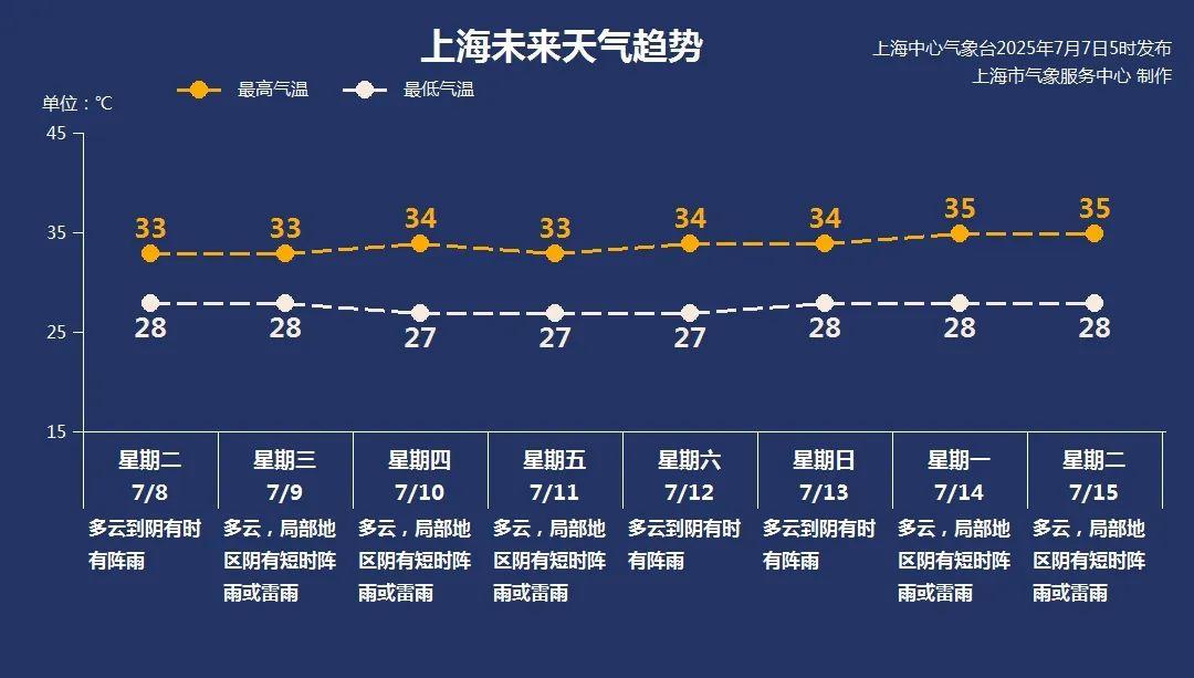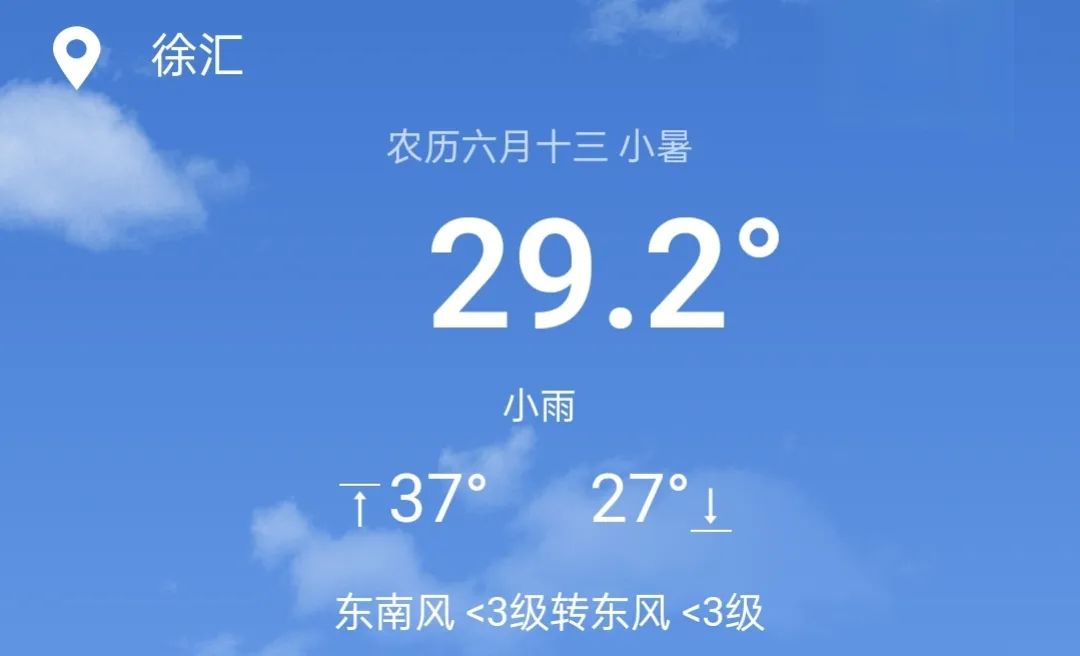 今天(7月7日)上海的烈日不再那么强烈,以多云天气为主,局部地区阴天,有时会有阵雨或雷雨。气温一开始就比较高,达到29℃,不过白天升温速度明显放慢,预计最高气温为34℃,东南风4 - 5级,阵风6级,相对湿度在90% - 45%之间。尽管炎热程度有所降低,但大家仍需做好防暑降温措施。