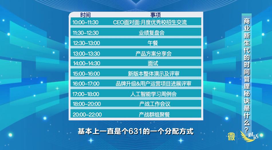 所谓631时间法则,就是60%的时间用于组织建设,如员工培训、文化沟通等“软基建”;30%留给产品评审,他认为自己管太多会添乱;10%用于AI相关新知识充电,比如参加人工智能学习周例会,分享相关研究工作。