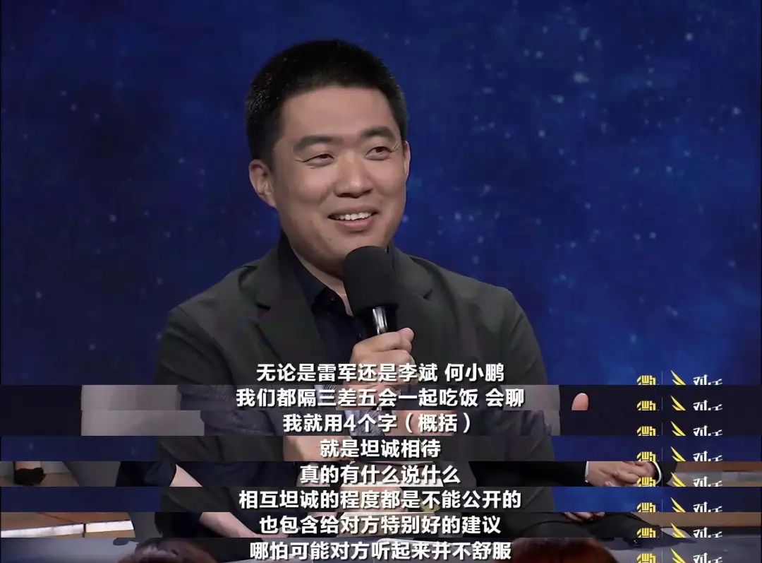 节目中,李想曝光了新能源车圈顶级大佬们的私密聚会。他说经常和雷军、李斌、何小鹏一起吃饭,主持人提醒“了解对手太多对自己不利”时,李想用“坦诚相待”概括他们的相处之道。