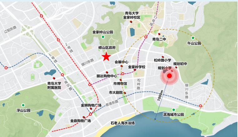 从位置来看,该地块处于主城区稀缺的黄金地段。它东邻崂山景区,南邻滨海城市公园,距离石老人沙滩仅800米;城市主干道松岭路、银川东路和香港东路在此交汇,地铁11号线、5号线也覆盖该区域。此外,地块附近还有市博物馆、市大剧院、市会展中心等文化设施,以及丰富的教育、医疗资源。