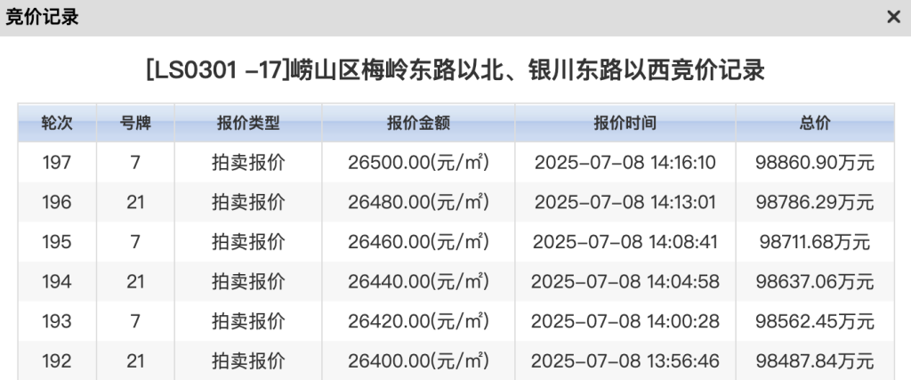 青岛崂山区一地块历经197轮竞价成交,溢价率达17.8%