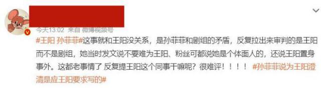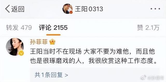 最终孙菲菲现身评论区,让王阳摆脱舆论风波。她留言称王阳当时不在场,希望大家别为难他,还表示欣赏王阳琢磨戏的态度。