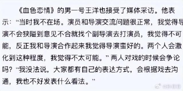 当年事件发生后,媒体采访王阳。他称当时不在场,还表示演员和导演交流问题很正常,不相信导演会因意见不合找人打演员,还说和导演合作感觉导演不错。