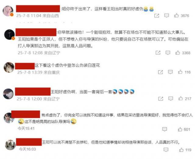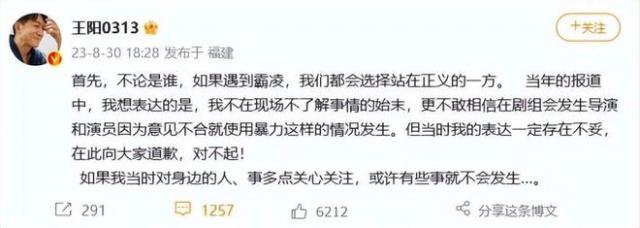 面对舆论,王阳发文回应。他强调会站在正义一方,称当年不了解事情始末,不敢相信剧组会发生暴力事件,还为当年表达不妥道歉。
