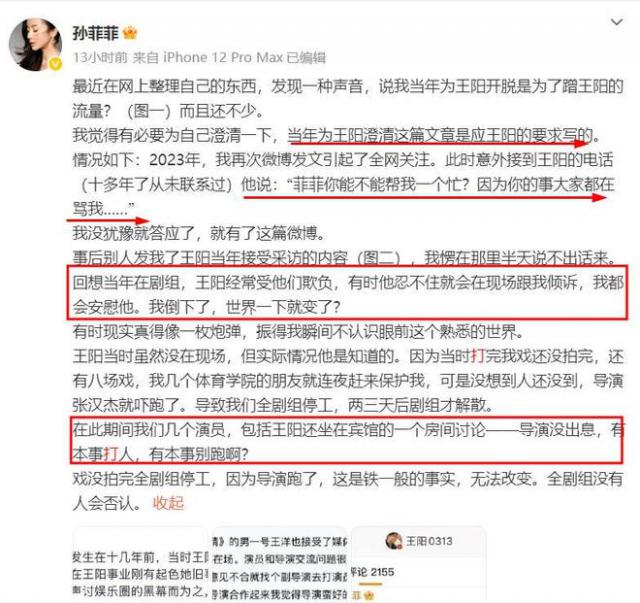 她描述细节,2023年发博引发关注后,10多年没联系的王阳突然打电话,说“菲菲你能不能帮我一个忙?因为你的事大家都在骂我……”孙菲菲没犹豫就答应,随后发了澄清微博。