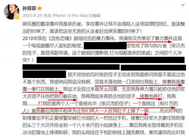 据孙菲菲发文,2010年拍摄《血色恋情》时,她遭到殴打。策划者是该剧导演张汉杰,其侄子杨兆华向她脸上吐浓痰并殴打她,制片方的姚远也参与其中。