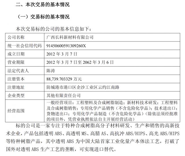 公开信息显示,标的广西长科是一家专注于特种合成树脂高分子材料研发、生产和销售的高新技术企业。长鸿高科此前曾提到,公司的产品是广西长科的重要原材料之一。在停牌公告中,长鸿高科对广西长科很看好,重点强调了广西长科的优势,即“透明ABS为中国大陆首家工业化量产本体法工艺,打破了国外对透明ABS生产工艺的垄断,可实现进口替代”。