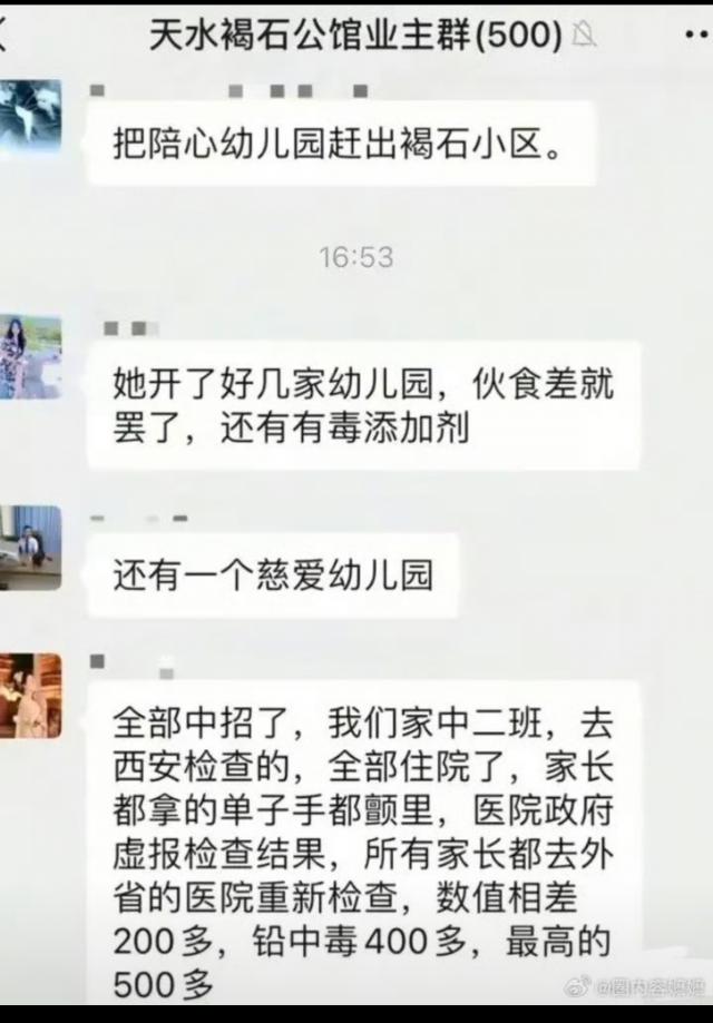天水幼儿园?红姐真没想到能看到如此阴间的新闻。起因是天水有家长联合在网上寻求帮助,他们的孩子就读同一家幼儿园,同时出现经常性呕吐等身体不适情况。一些家长在本地医院没查出结果,另一些家长带孩子跨省住院,发现孩子们血液中铅含量异常高。