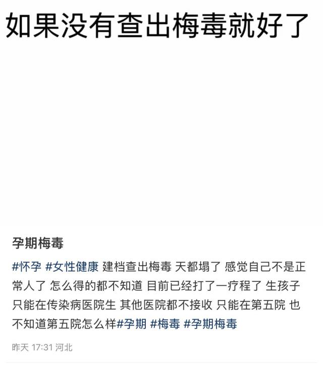 孕妇染病?红姐真想求求一些姐妹,找男人的时候把眼光放高点。红红在首页刷到一位姐妹的求助帖,她孕期验血确诊了梅毒,这导致她无法选择更专业的妇幼医院,只能去专门治疗传染病的医院生,她很担心这家医院能否提供专业服务。红姐看到她的思路有点迷茫,不应该先确定下谁传染给她的吗?都得了这种病还不想办法远离病原体!哦,原来她已经确定是她老公传染给她的了。让红姐最头大的是,她好像在怀孕之前就知道她老公的某些问题了。为了孩子也别选这种男人啊。孕妇身患梅毒会影响腹中孩子,孩子一出生可能就有梅毒牙,就算治好了孩子也是终身携带抗体,很多工作都做不了,这真是天崩开局。
