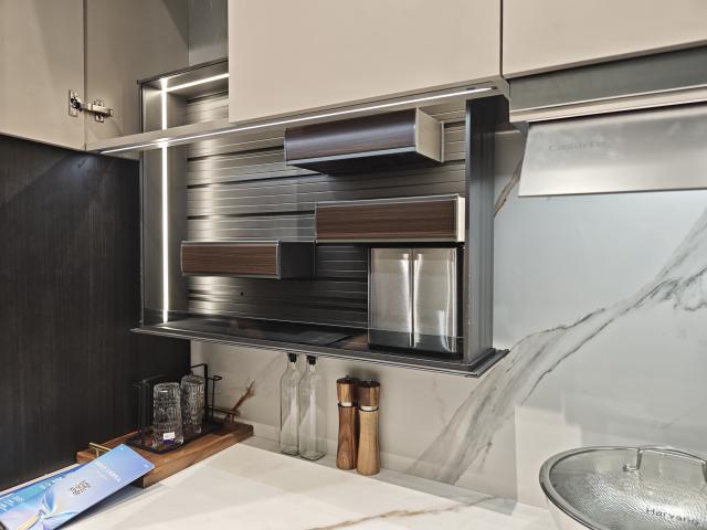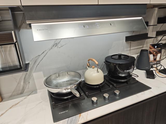 功能上,展示了新奇的“烟柜”联动。不用时,调料柜自动收起;打开燃气灶,调料柜自动下降,方便拿取烹饪用具。