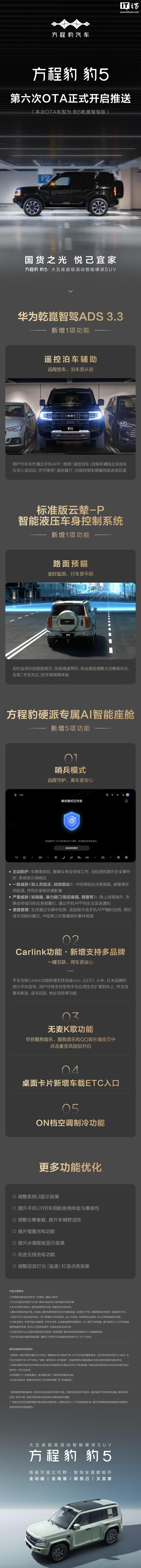 IT之家7月8日消息,比亚迪方程豹汽车宣布旗下豹5的第六次OTA升级正式开启推送。此次升级针对豹5乾崑智驾版,目的是进一步提升车辆的智能化水平和用户体验。