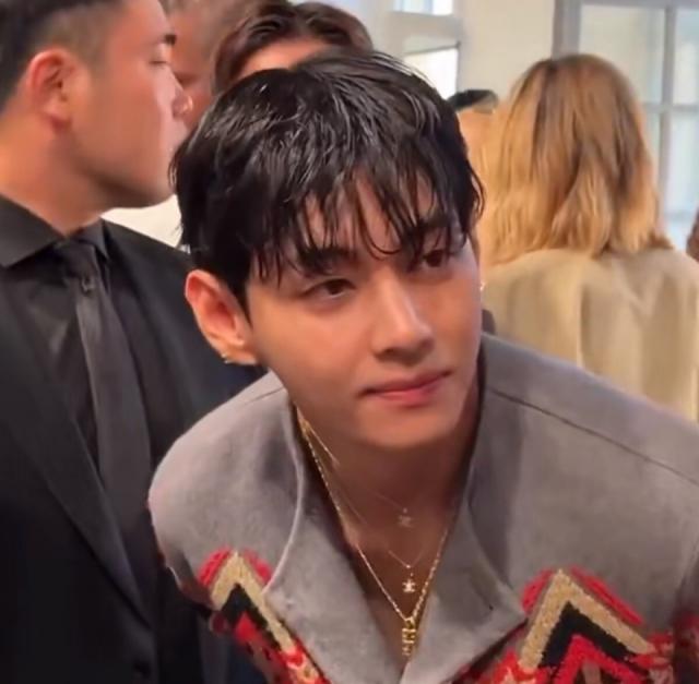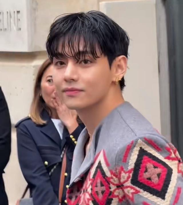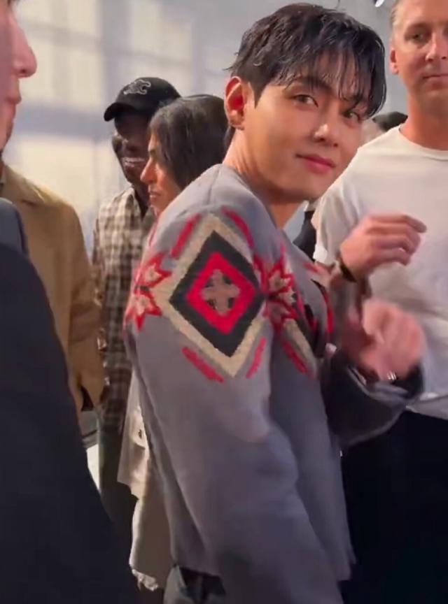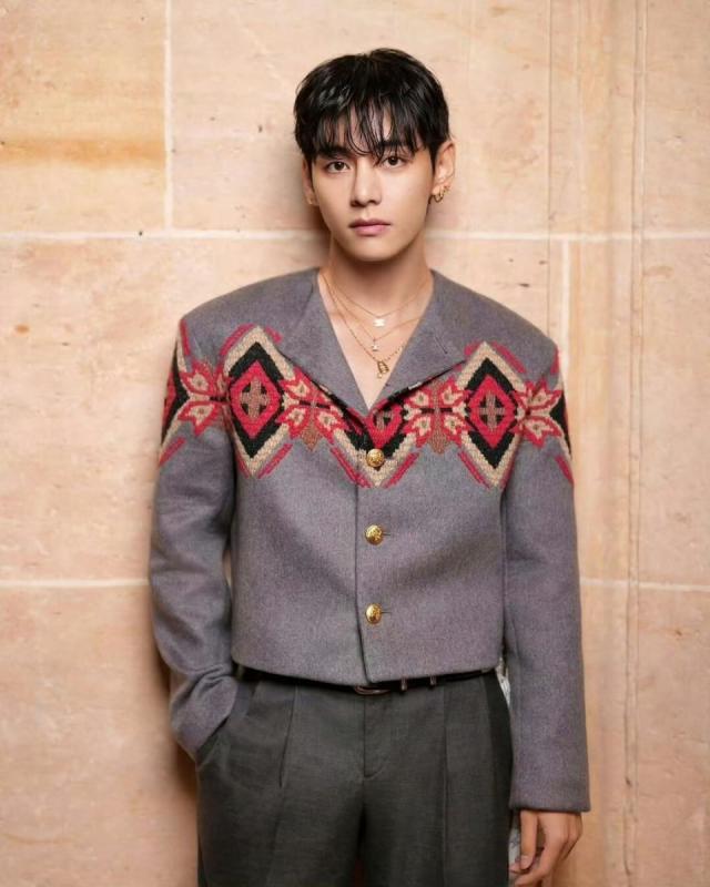 金泰亨风格与朴宝剑不同,他选了一套灰色系装扮,上半身灰色短款外套花纹独特,配上灰色阔腿裤,又潮又时尚。