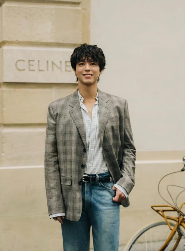 当天他是少见的卷发造型,上身叠穿,用背心、格子衬衫和格子外套搭配出时尚感,配上牛仔裤,时尚又摩登。