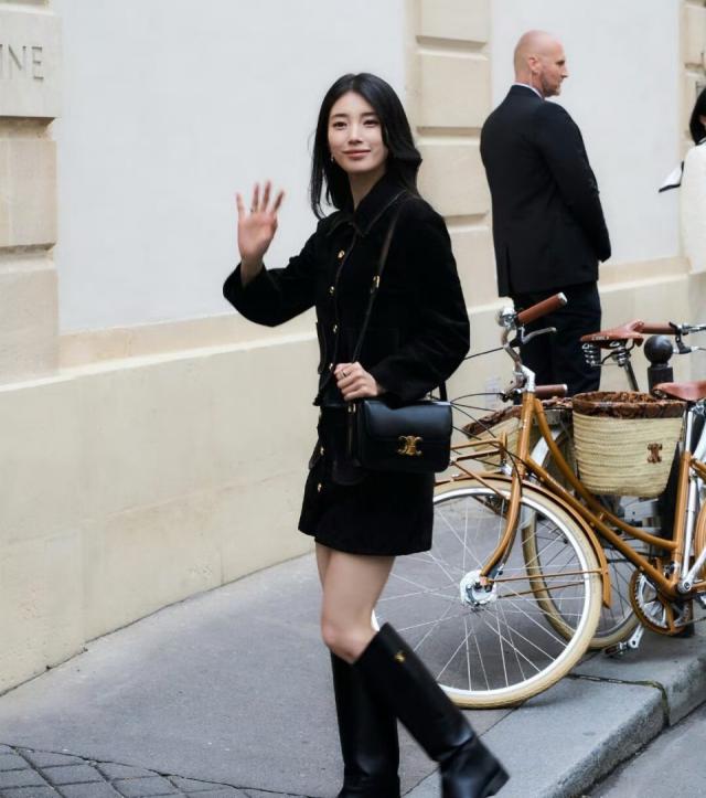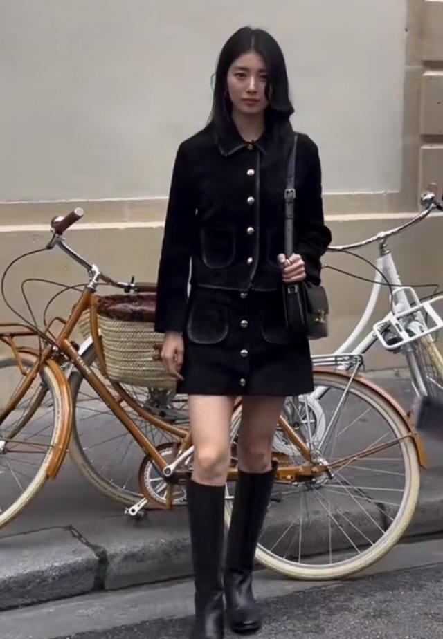 裴秀智的身材比例更是绝佳,这种套装容易显腿短,但即便搭配黑色长筒靴,她的大长腿依然十分抢镜。