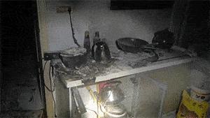 火灾造成厨房内的微波炉、电饭煲、橱柜、冰箱等烧毁,吊顶也被烧穿。