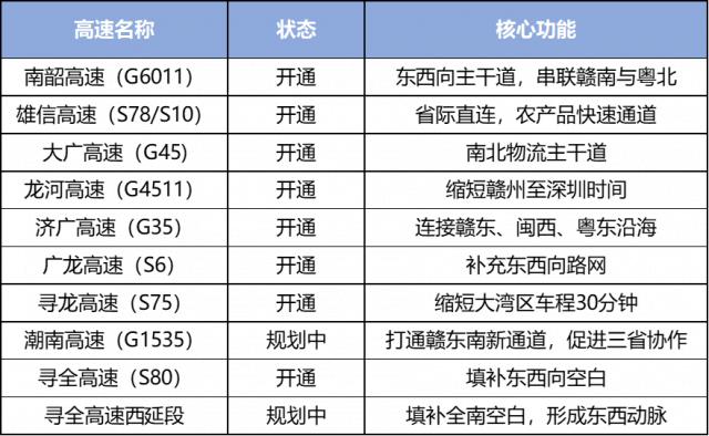 截至2024年,江西与广东规划的8条跨省高速通道已建成7条,形成“七通一建”的路网格局。已通车的龙寻、雄信等高速覆盖了双方交界6个县市中的5个,仅剩全南县需借道通行。在建的潮南高速(潮州—南昌)计划2029年竣工,寻全高速西延段也将于2029年通车,届时全南县将结束无直连广东高速的历史,实现省界县域高速100%全覆盖,构建“八纵多联”新路网。