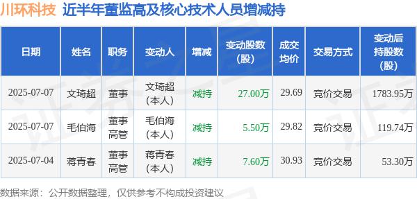 川环科技:7 月 7 日高管文琦超、毛伯海合计减持 32.5 万股