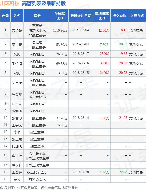 川环科技近半年内董监高及核心技术人员增减持详情如下:
