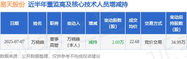 易天股份:7 月 7 日高管万晓峰减持 2.69 万股