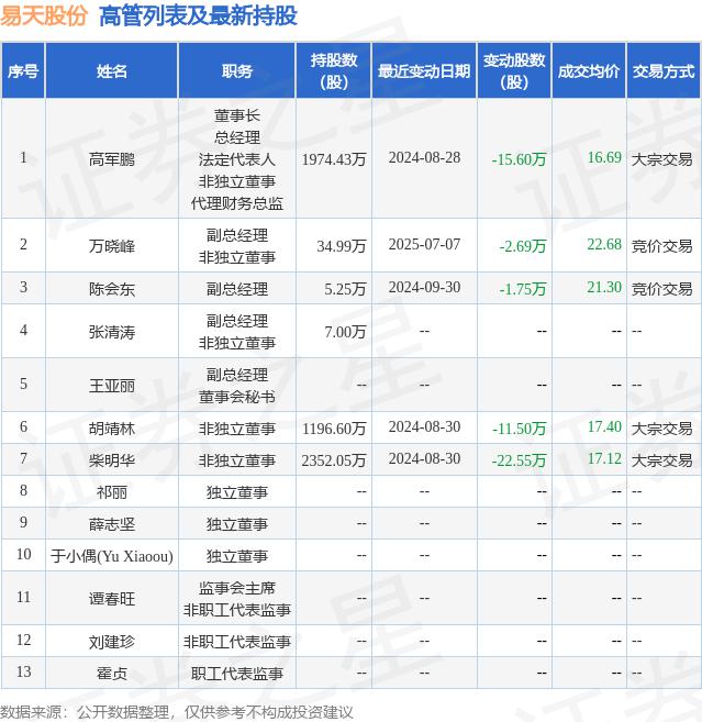 易天股份的高管列表及最新持股情况如下: