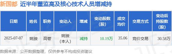 新国都:7 月 7 日高管姚骏减持 10.19 万股股份