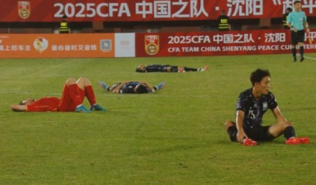 终场哨响,中国球员全部累瘫在地,狂奔近100分钟,他们已无力动弹。同时,与中国队缠斗一晚的韩国球员也快虚脱,大口喘着粗气。