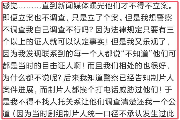 此事经媒体曝光后立案,但仅立案未调查。孙菲菲找目击证人,大家都称“不知道”,后来得知是制片人威胁所致。