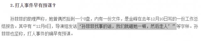 孙菲菲的助理当时称,偶然捡到一个U盘,里面有份总结报告,导演组称若孙菲菲找事就揍她一顿然后走人。