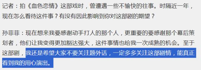 一年后《血色恋情》开播,记者就被打一事询问孙菲菲,她没多做回应,希望大家关注剧情。