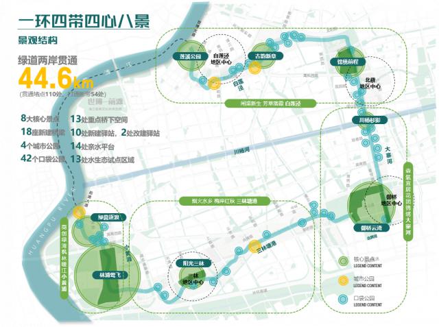 在世博水环的整体景观构建方面,“一环四带四心八景”的规划,涵盖了白莲泾地区中心、北蔡地区中心、御桥地区中心、三林地区中心等“四心”,以及白莲泾带、大寨河带、三林塘港带、小黄浦带等“四带”。