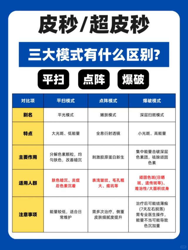 接下来重点说说超皮秒。一般来说,皮秒/超皮秒有3种模式——平扫、点阵、和蔡文静同款“爆破”。