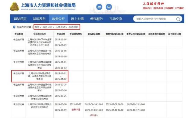 本市2025年度全国初级、中级经济专业技术资格考试预计于今年11月1日至2日举行,具体考务信息可关注“上海市人力资源和社会保障局官网——政务公开——人事考试——考试项目”栏目下当年度的相关通知。