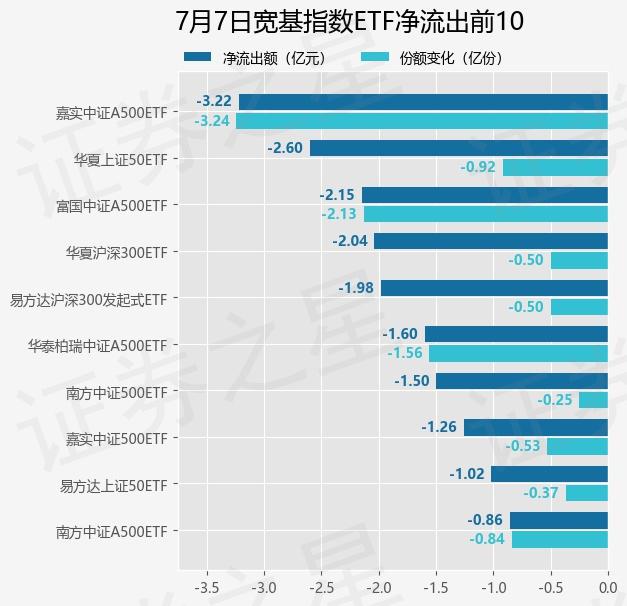 据证券之星消息,7月7日宽基指数ETF基金合计资金净流出23.39亿元,近5个交易日累计净流出299.33亿元,且这5个交易日每日均出现合计资金净流出(ETF资金流向计算公式:(当日ETF场内流通份额 - 前一交易日ETF场内流通份额)* 当日ETF均价,计算结果仅供参考)。