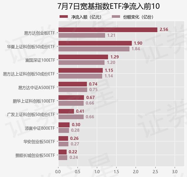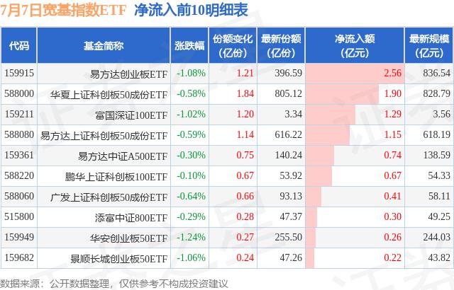 当日有36只宽基指数ETF基金出现资金净流入,其中易方达创业板ETF(159915)净流入额居首,份额增加了1.21亿份,净流入2.56亿元。