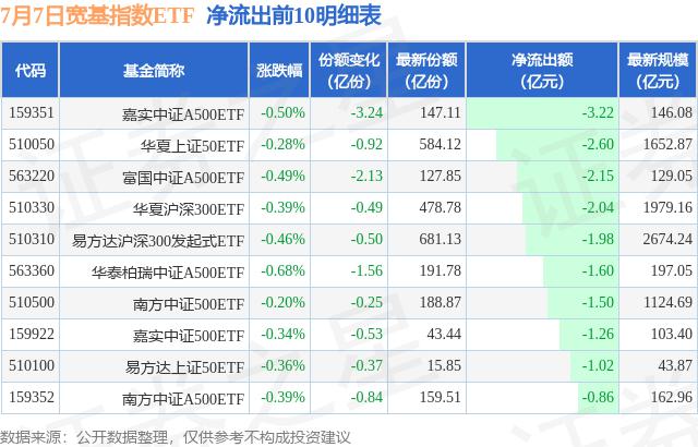 当日有114只宽基指数ETF基金出现资金净流出,其中嘉实中证A500ETF(159351)净流出额居首,份额减少了3.24亿份,净流出3.22亿元。