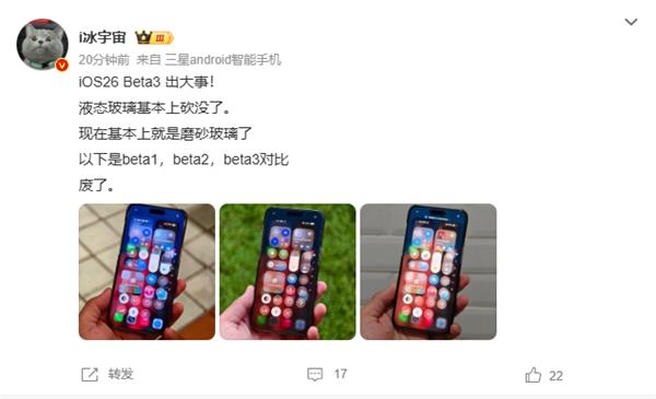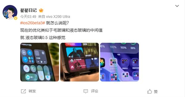 众多升级到iOS 26 Beta 3的用户反馈,液态玻璃质感明显削弱,呈现出类似毛玻璃和液态玻璃之间的中间状态,就像是液态玻璃0.5的感觉。