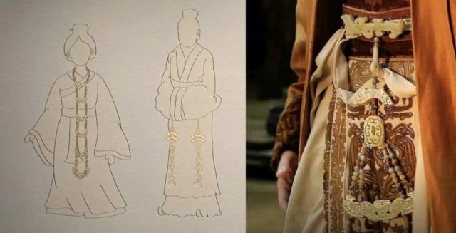 陈都灵所佩戴的是玉组佩,它又叫“组玉佩”或“杂佩”,是用各种形状的玉片,像玉璜、玉珩、玉琚、玉瑀、玉冲牙等配件串联起来的装饰。《礼记 · 玉藻》提到,“古之君子必佩玉”,“君子无故玉不去身”,可见玉佩是很重要的礼仪装饰,其主要目的是彰显主人的身份地位。