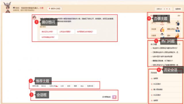 “小贵”的主要功能有猜你想问、推荐主题、会话框、办事主题(个人办事、企业办事)、热门问题、历史会话等。