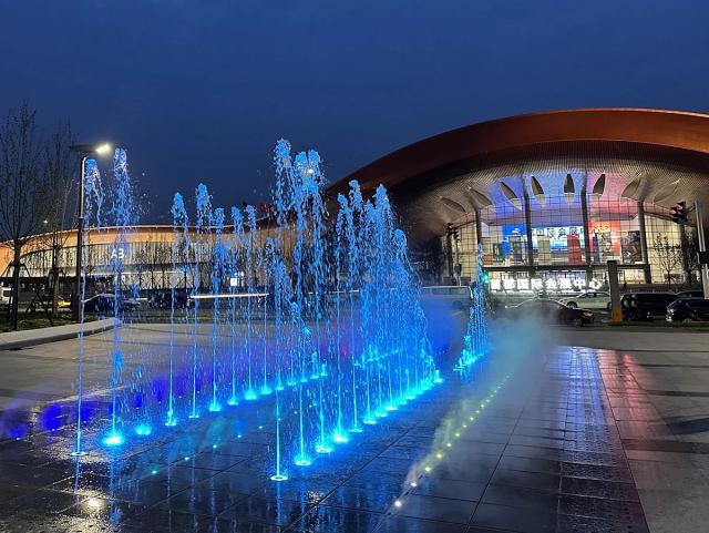 首都国际会展中心东侧,48块主题花砖“诉说”千年丝路文明,喷泉随着中外名曲起舞。夜幕降临,水雾与灯光交相辉映,将展馆衬得更加耀眼。