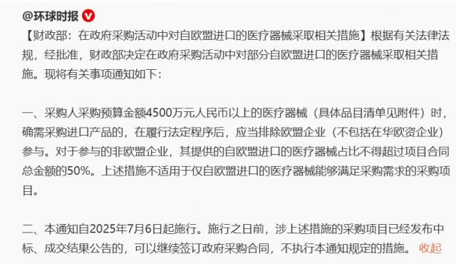 没错,中国要是不采取强硬行动,欧盟还真意识不到自己的错误。欧盟为了讨好华盛顿,甘愿充当打压中国的“马前卒”。而中国不再选择隐忍,果断出手反击。财政部发布公告,明确在政府采购活动中,排除欧盟企业(不包括在华欧资企业)参与,同时对非欧盟企业采购欧盟进口医疗器械的比例进行限制,这一举措直击欧盟要害。