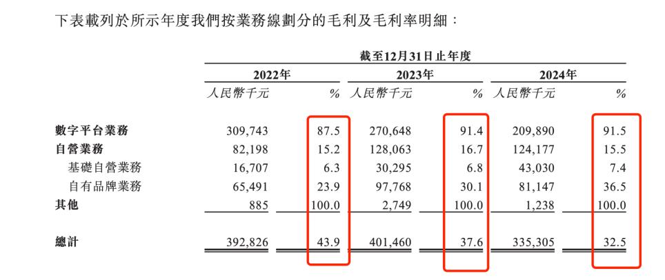 所谓数字平台业务,就是链接母婴店和上游的品牌及制造商,类似大型经销平台。这一业务收入持续萎缩,从2022年的3.54亿缩减到2024年的2.3亿,下滑了35%。
