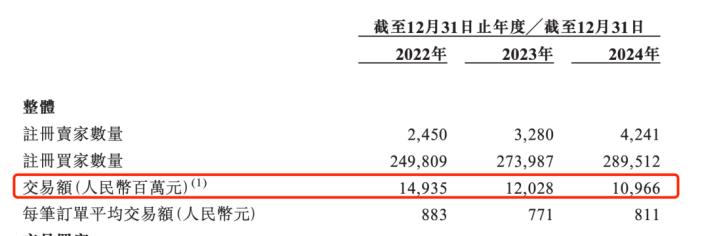 招股书显示,虽然注册买家和卖家数量在增加,但核心数据却在下滑。比如实现交易的买家数量,从2023年的17.2万减少到2024年的16.8万,核心买家数量从2023年的10.4万缩减到2024年的9.4万,减少了9.6%。平台总交易额(GMV)也持续下滑,从2022年的149亿降至2023年的120亿,再降至2024年的110亿,两年缩减了26%。