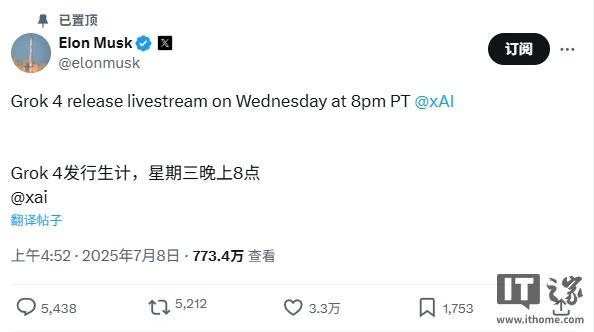 IT之家7月8日消息,马斯克今日发帖宣布,xAI新一代Grok 4大模型将于太平洋时间周三晚8点,也就是北京时间周四上午11点发布,届时将在X上进行直播。