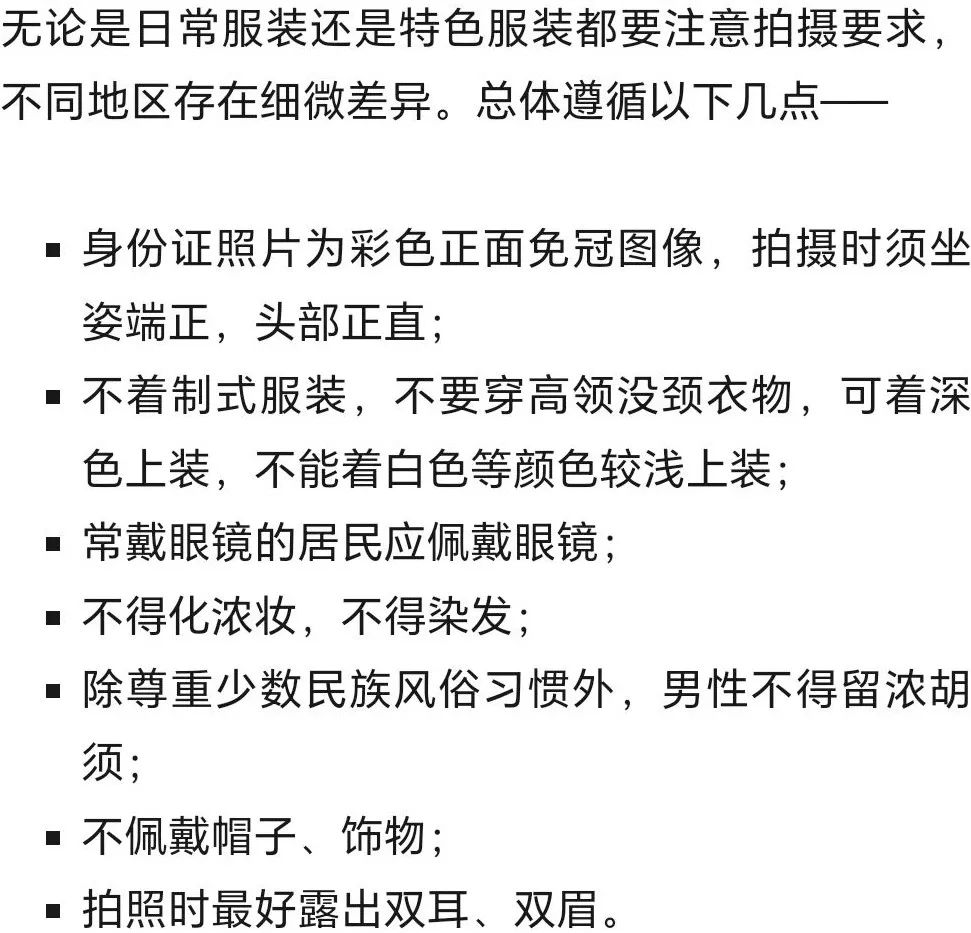 需要提醒的是,不管用哪种方式换领身份证,都要重新拍照。拍照时,除了不能穿高领没颈和低领上衣外,对衣服颜色、发型、妆容等也都有相关要求。
