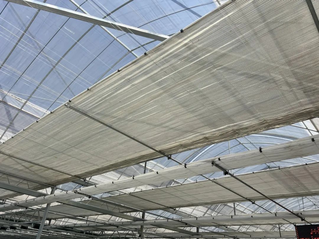 上午8点,室外气温刚过30℃,蔬菜大棚内的温度却已接近38℃。上海宝农优供农业科技有限公司的农技人员王玉伦打开手机APP,轻轻触碰屏幕,大棚顶部的双层遮阳系统便缓缓展开。黑色的外遮阳帘能过滤掉大部分强光,而带有反光膜的内遮阳帘则可以有效反射紫外线,为油麦菜、生菜、紫甘蓝等叶菜提供了双重保护。