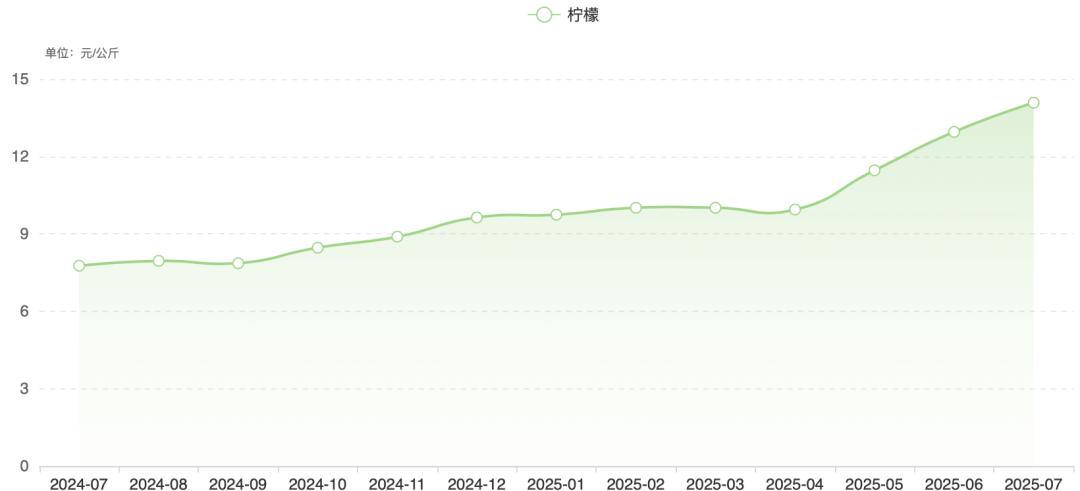 农业农村部全国农产品批发市场价格信息监测数据显示,自去年6月起,全国柠檬批发价格持续上涨。2025年7月,已涨至14.08元/公斤,而去年同期仅为7.76元/公斤,同比涨幅超80%。