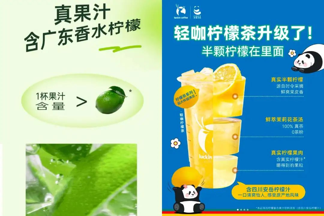 瑞幸柠檬茶系列,2024年7月上新的柠檬茶添加广东香水柠檬果汁,近期升级版本改为添加安岳黄柠檬果汁,并放入柠檬果粒和半颗黄柠檬。